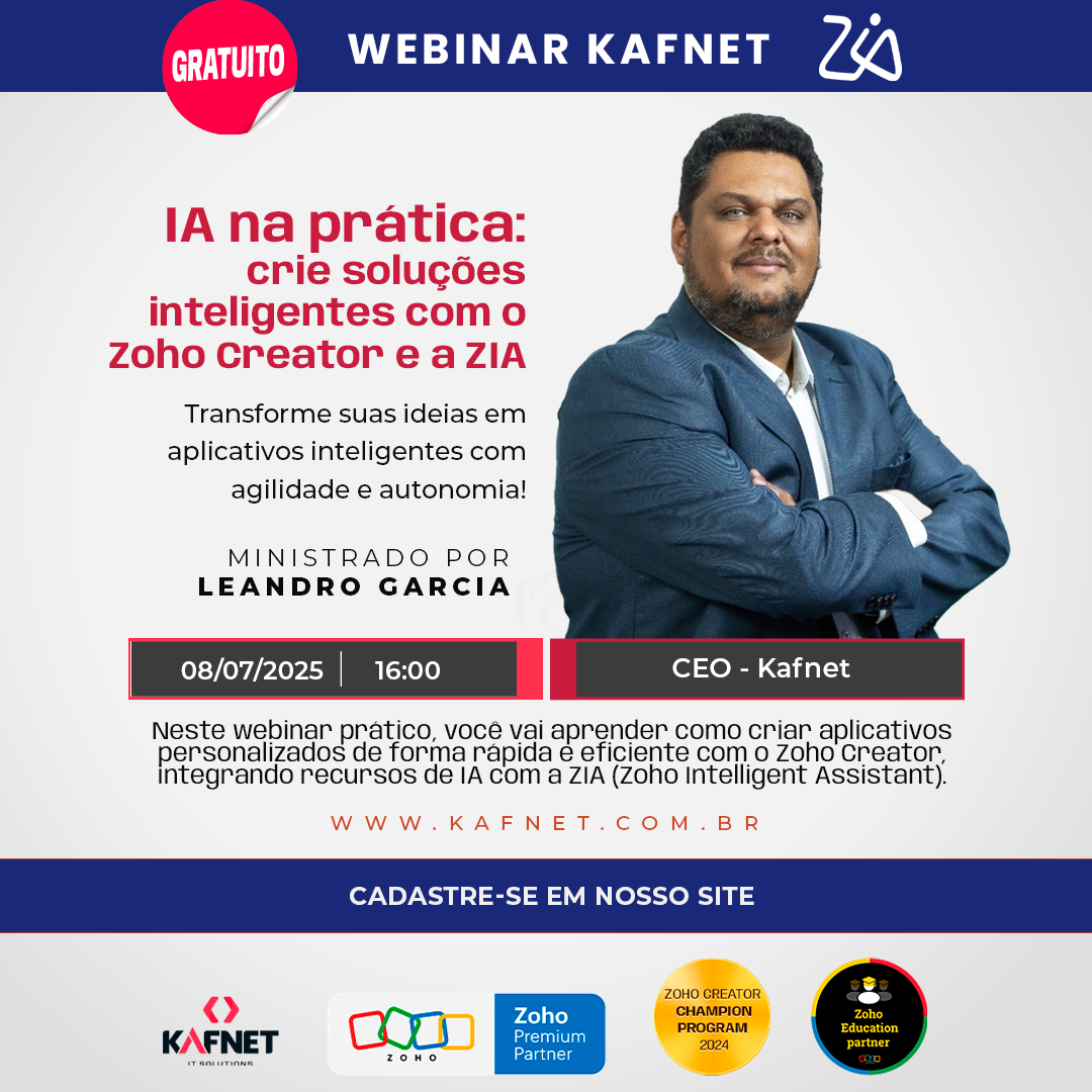 CategoriesEventos 8 de julho de 202529 de outubro de 2025 kafnet25new IA na prática: crie soluções inteligentes com o Zoho Creator e a ZIA Navegação de PostPrevious post Webinar: Suporte Data-Driven com Zoho Desk e Zoho Analytics Next post Aula #1 Decisões Baseadas em Dados: Aplicando Machine Learning com o Zoho Analytics Deixe um comentário Cancelar respostaO seu endereço de e-mail não será publicado. Campos obrigatórios são marcados com * Salvar meus dados neste navegador para a próxima vez que eu comentar. Publicar comentário